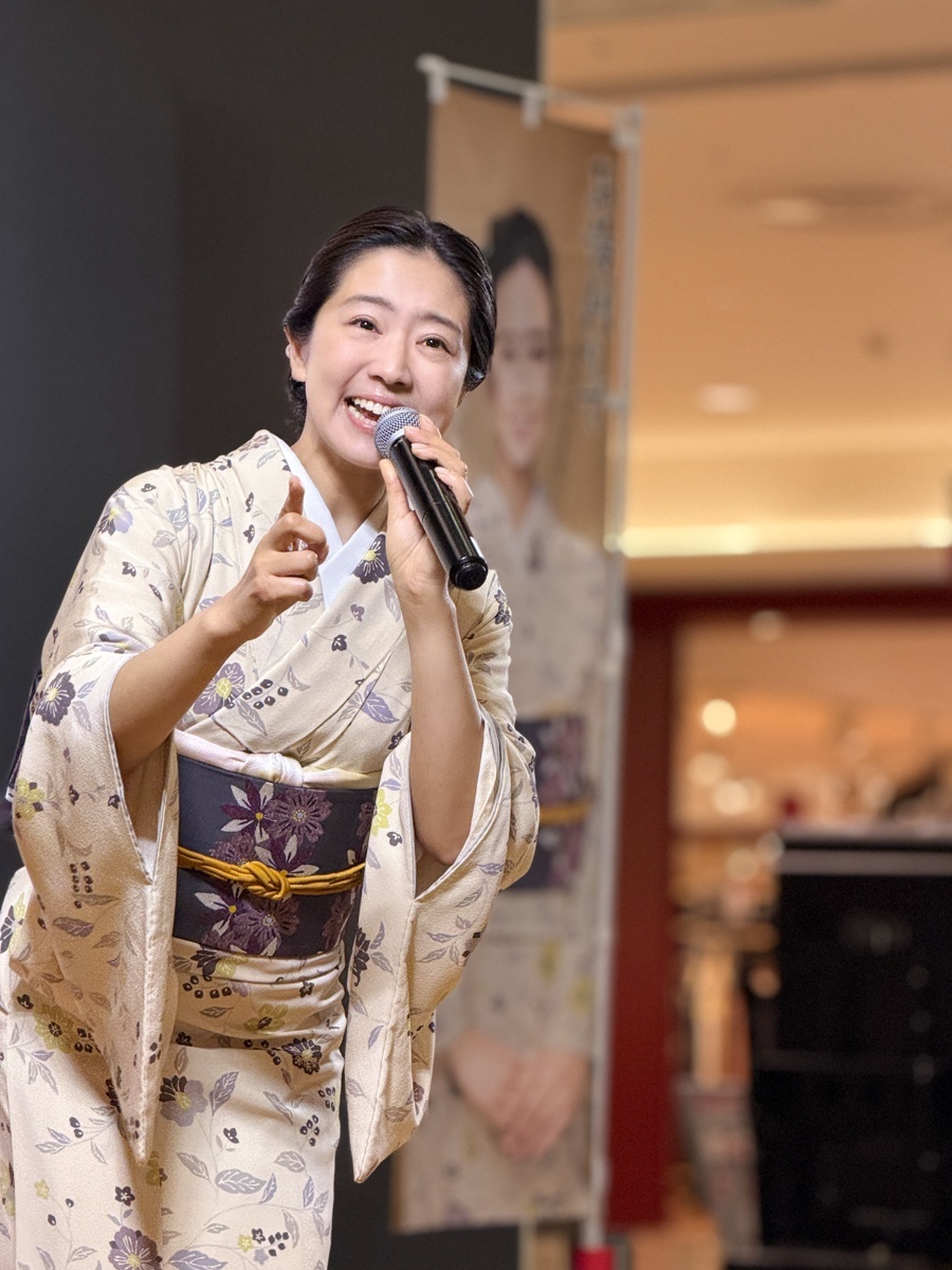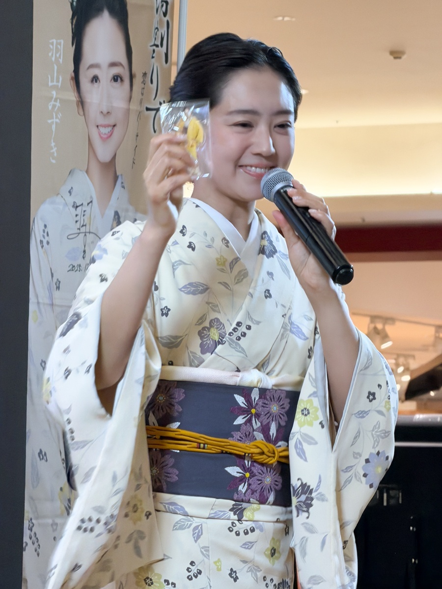 そして、デビューからあっという間に10年。大人の魅力あふれるステージを披露してくれた羽山みずきさん。新曲『お湯割りで』は演歌ファンから好評で、カラオケでも多くの方に歌われているようです。コンサートDVDも多数お買い上げいただき、特典のアクリルキーホルダーを手にしたファンの皆さんは、嬉しそうにさっそくカバンに付けていました。