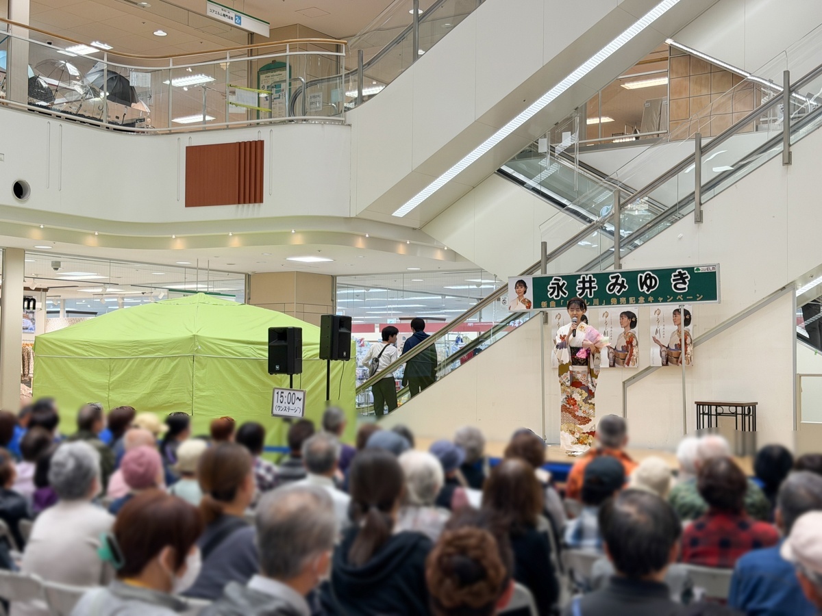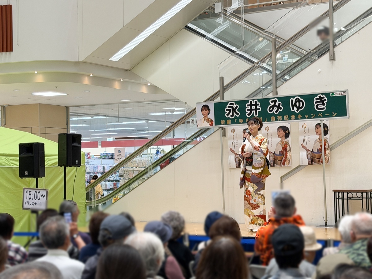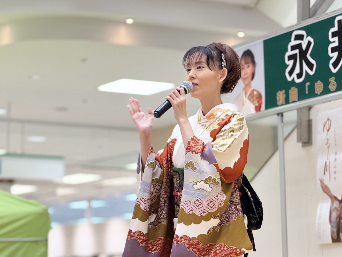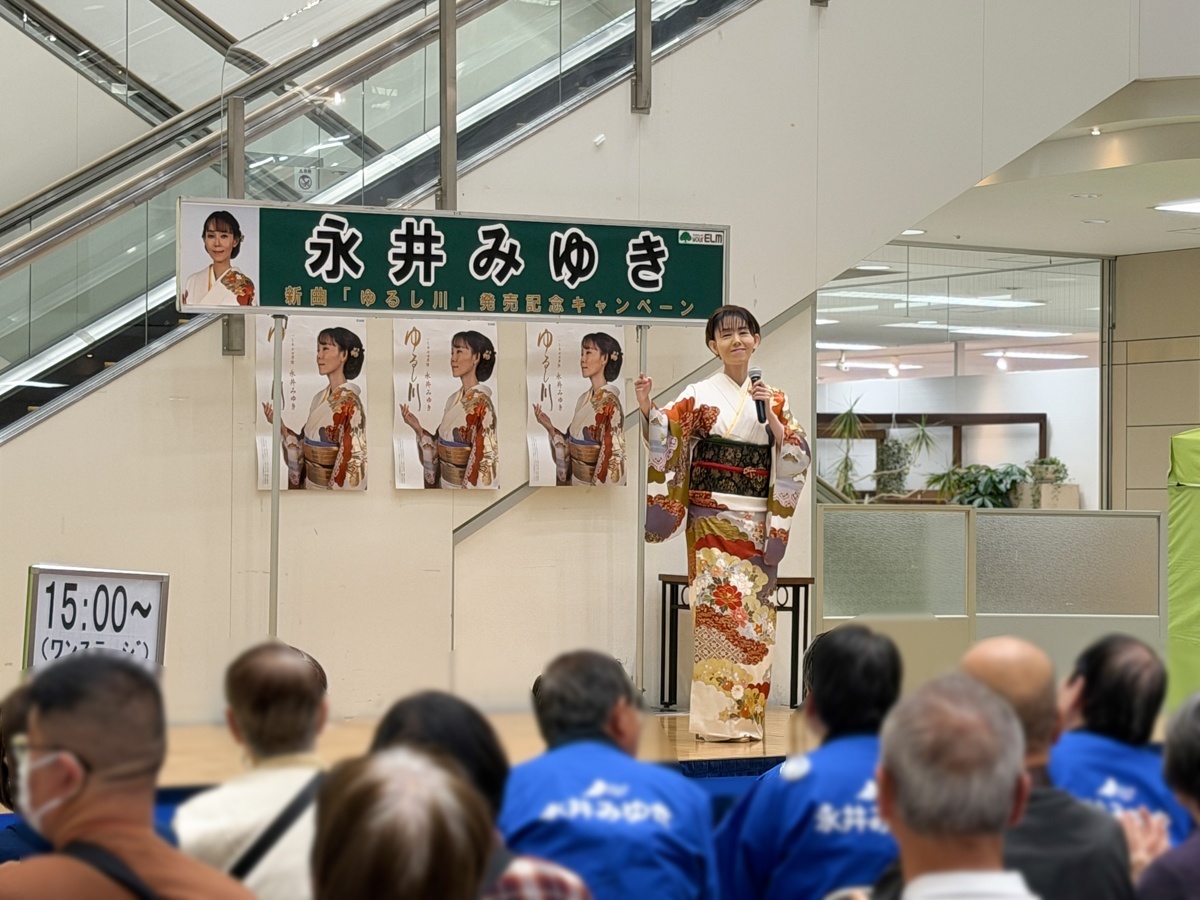 15時の永井みゆきさんは新曲『ゆるし川』キャンペーン。永井さんは昨年、新曲発売直後に交通事故に巻き込まれるという困難に見舞われましたが、3ヶ月の休養を経て見事に復活!この日は、多くのファンが温かな声援とともに駆けつけ、会場は熱気に包まれました。困難を乗り越えたからこそ響く、優しくも力強い歌声。元気にステージに立つその姿に、会場全体が勇気をもらったひとときでした。