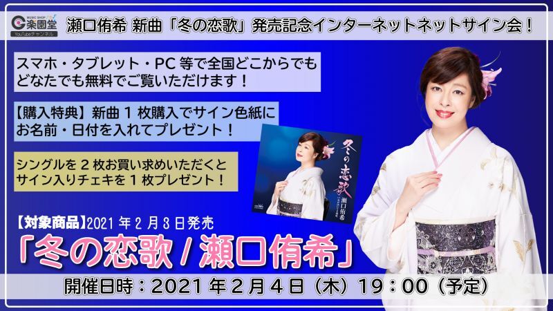 瀬口侑希の2月3日のニューシングル「冬の恋歌」。新曲は瀬口侑希が歌う女の演歌の真骨頂ともいえるスケール感のあるマイナーなメロディが光る1曲です。発売を記念したミニライブとインターネットサイン会をお楽しみください。