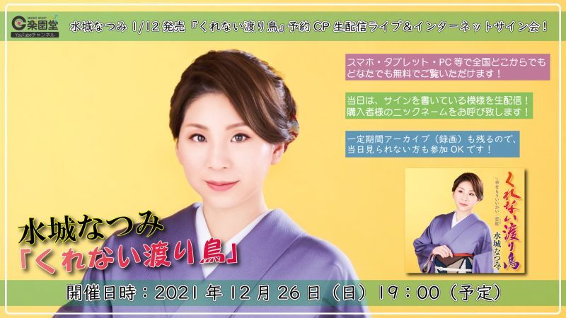 水城なつみ 1/12発売『くれない渡り鳥』予約CP 生配信ミニライブ&インターネットサイン会【12月26日楽園堂YouTubeチャンネル】 [KICM-31046]