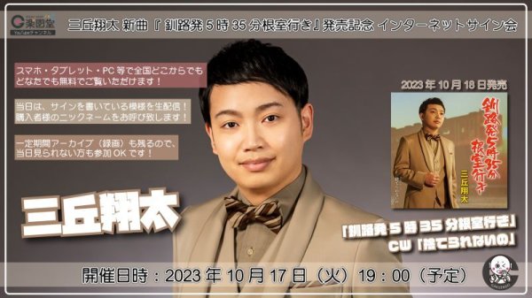 三丘翔太 新曲『釧路発5時35分根室行き』発売記念 インターネットサイン会【10月17日楽園堂YouTubeチャンネル】 [TECA-23065]